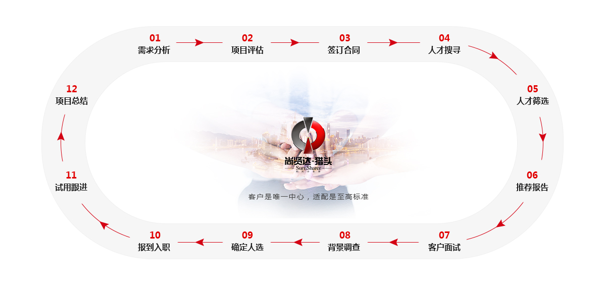 11、試用跟進(jìn): 客戶付清余款,尚賢達(dá)跟進(jìn)候選人試用期/保證期表現(xiàn),協(xié)助雙方順利磨合,使候選人盡快融入公司,工作步入正軌;